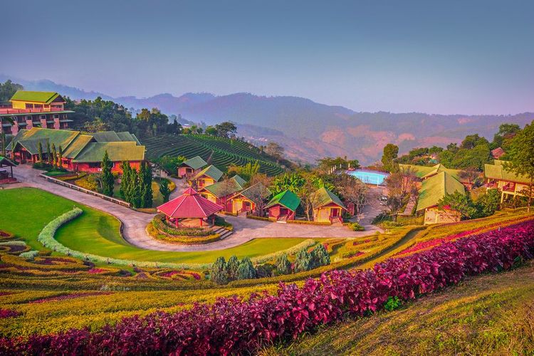 Magnificent view of doi mae salong mountain with a village in chiangrai