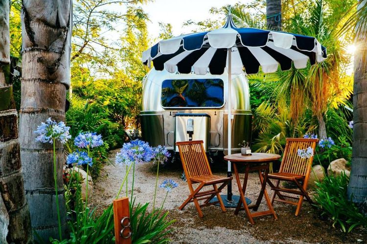 The charm of airstream caravans in a green setting. Strolling through the pleasant town of Ojai in the spirit of California is the Caravan Outpost concept. These small, unusual dwellings will delight travellers looking for the camping spirit... with all the comforts of home! All arranged in a circle on the site, the ten aluminium caravans sleep three or four people.
