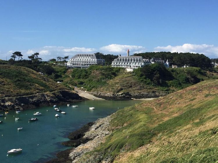 At the top of a hill overlooking Goulphar Bay, the hotel offers a magnificent view of the rocks plunging into the ocean.