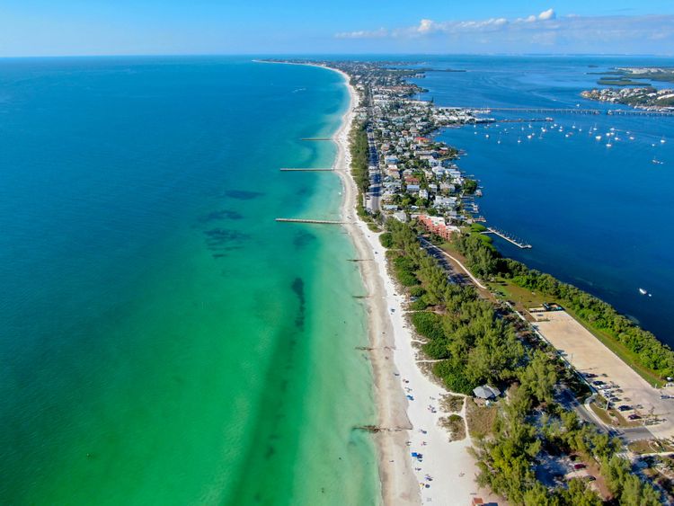 The Sarasota Keys are a group of barrier islands that protect the coast around Tampa Bay on the Gulf of Mexico. The most northerly is Anna Maria Island, quietly residential with its colourful holiday homes and, above all, its immense white sandy beaches.