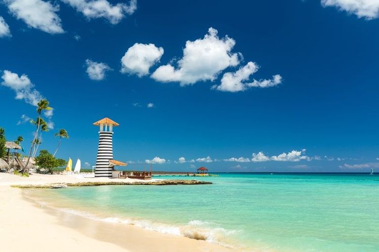 The beautiful Playa Dominicus and its emblematic lighthouse, which houses a bar, at the Iberostar Hacienda Dominicus.