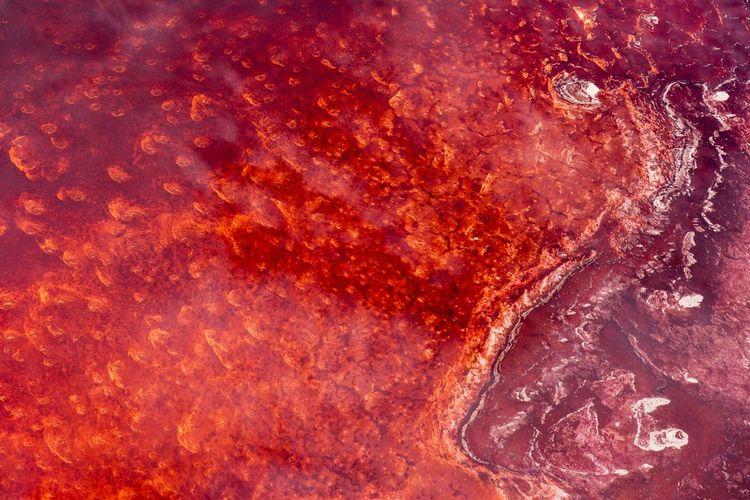 Its main feature is its depth, which is no more than 50 centimetres! Lake Natron is known for its high concentration of soda ash and chemical natron, which gives it an astonishing and fascinating orange-red colour. These dark red waters sometimes reach 140°C, while the average temperature of the lake is around 40°C. When the freshwater evaporates, what remains is water with a high concentration of saline minerals such as sodium and trona. Spirulina, an algae with a blue-green hue, is found all over the site, providing a pretty colourful spectacle. It's a thriving breeding ground for bacteria and algae.