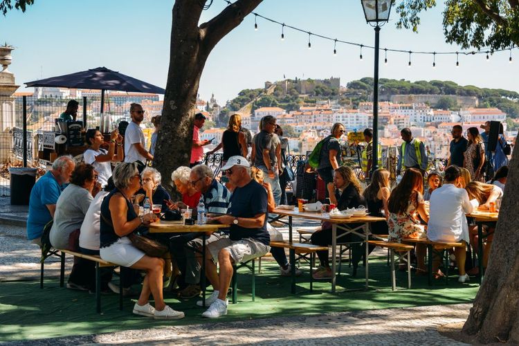 Tourists enjoy the panoramic view from the Miradouro São Pedro de Alcântara over a snack, Lisbon, Portugal.