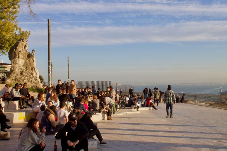 People enjoying the sunset at the Mirador de Santa Catarina, Lisbon, Portugal.