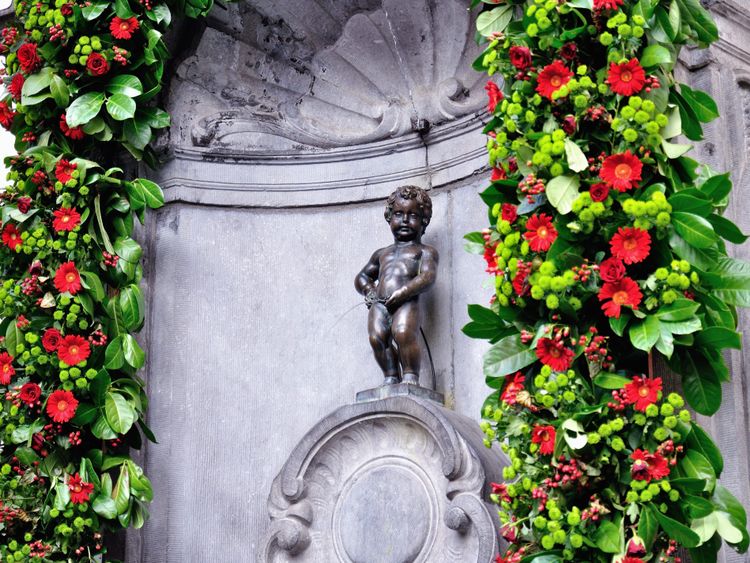 The Manneken Pis statue adorned with flowers in spring, Brussels, Belgium.