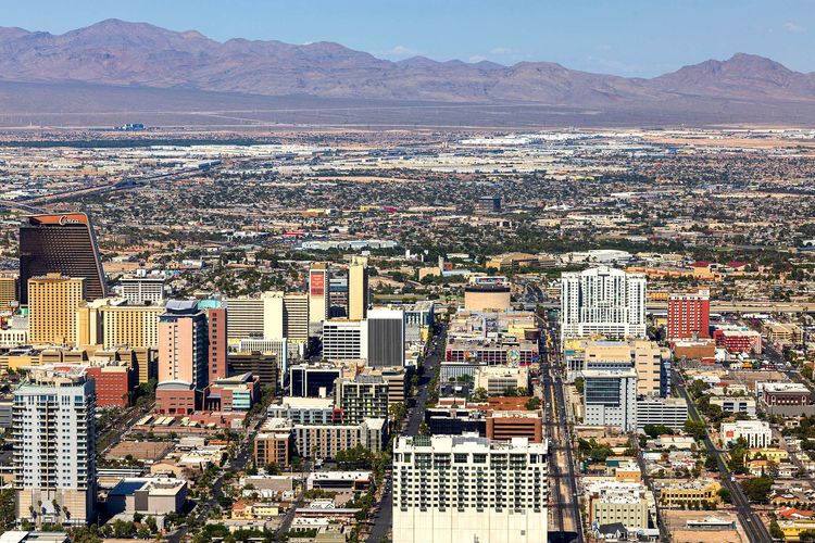 Vue aérienne sur Las Vegas, le désert de Mojave et la Sierra Nevada