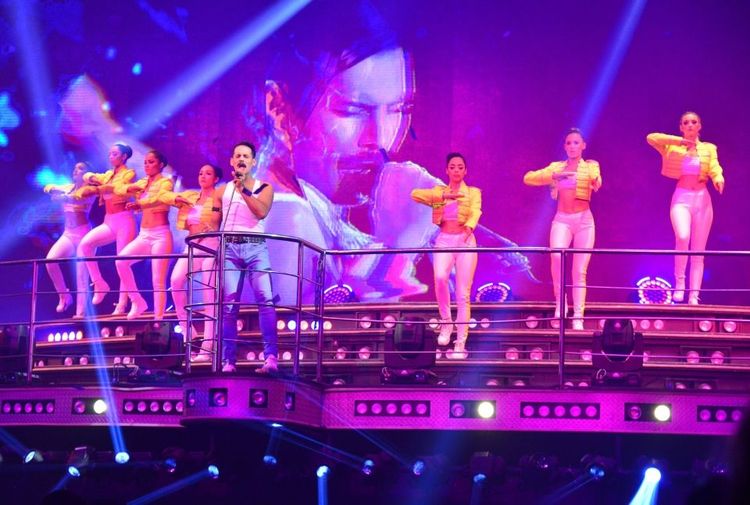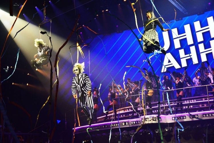 There's a Queen concert with Freddie Mercury 'in person' performing Bohemian Rhapsody, an angel with diamonds flying through the air to the tune of The Beatles' Lucy in the Sky With Diamonds, acrobats, flying fairies and other acts, not forgetting scenes from films such as 300 and Mad Max Fury Road, with the flying guitarist playing his fire-breathing guitar!