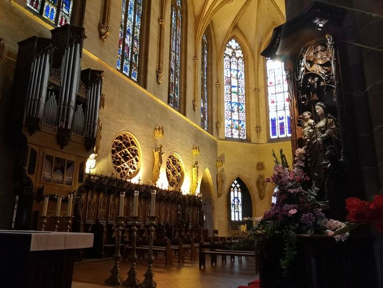 The current Gothic collegiate church was rebuilt between 1235 and 1365. The use of Vosges sandstone in warm tones ranging from light yellow to violet gives the church all its beauty. The building was never fully completed, as the originally planned north tower is still missing.