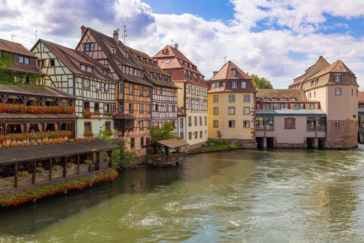 Traditional half-timbered houses on the canals of Petite France in Strasbourg, France.