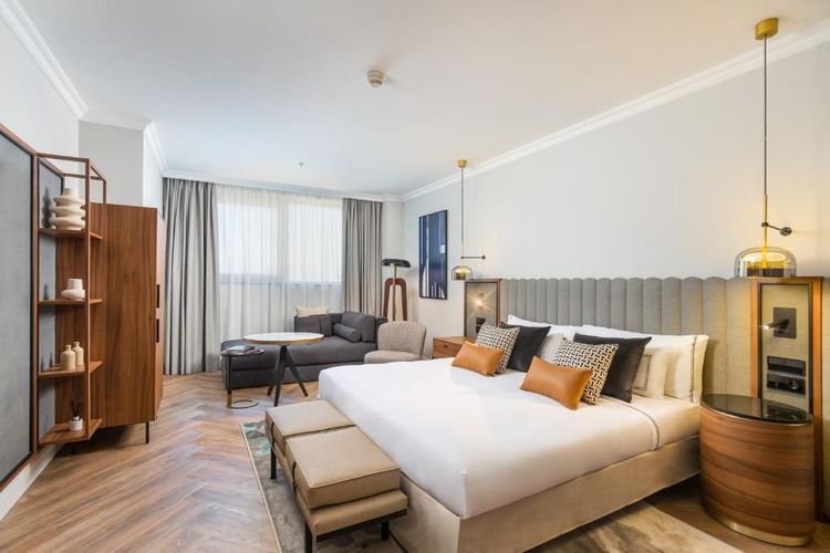 The Westin Valencia offers a unique guest experience, combining classic sophistication with modern luxury. The hotel's grand atrium lobby is flooded with natural light and gleaming marble floors, creating an atmosphere of elegance and grace. Beyond the lobby is a lush garden courtyard surrounded by fountains and sculptures, providing a peaceful retreat from the hustle and bustle of the city. Art Deco touches are everywhere, from the double-height lobby to the rooms and suites. All rooms have private terraces with Jacuzzi baths. The hotel offers Japanese and Mediterranean restaurants, as well as a swimming pool, spa and fitness centre.