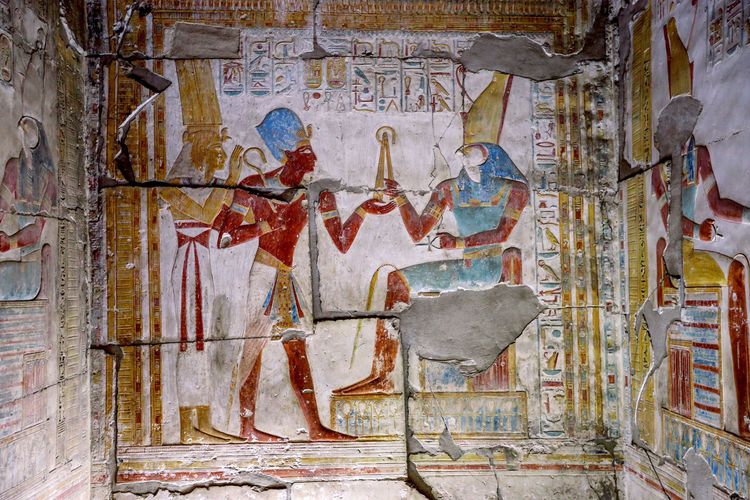 Abydos, temple of Sety I, Horus receives the wheat flail from Sety I.